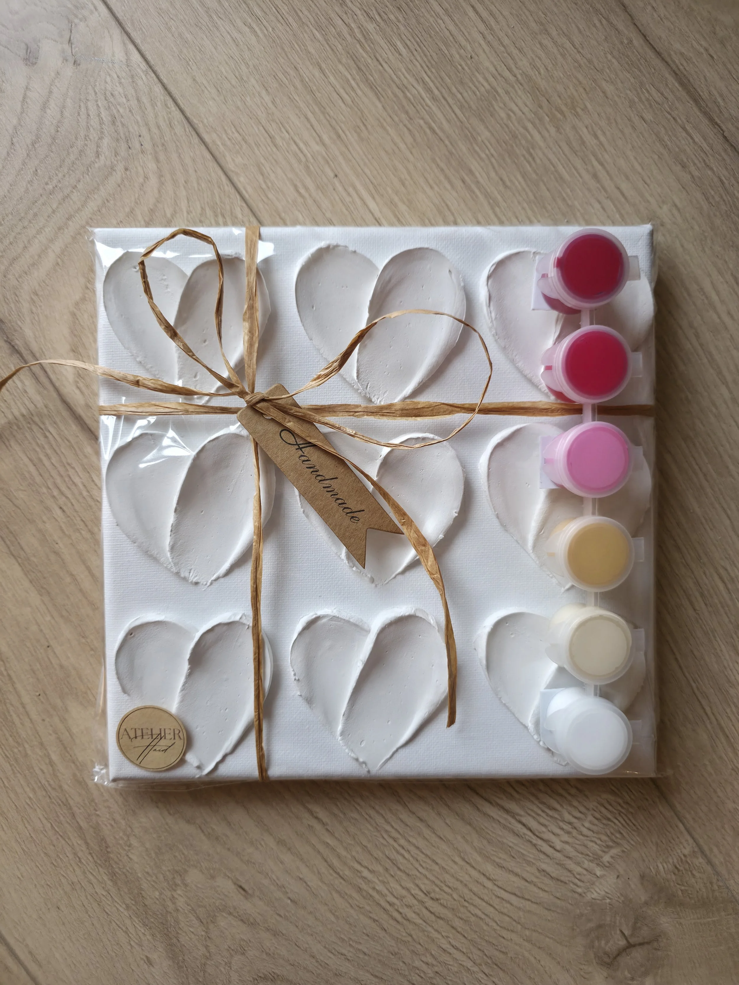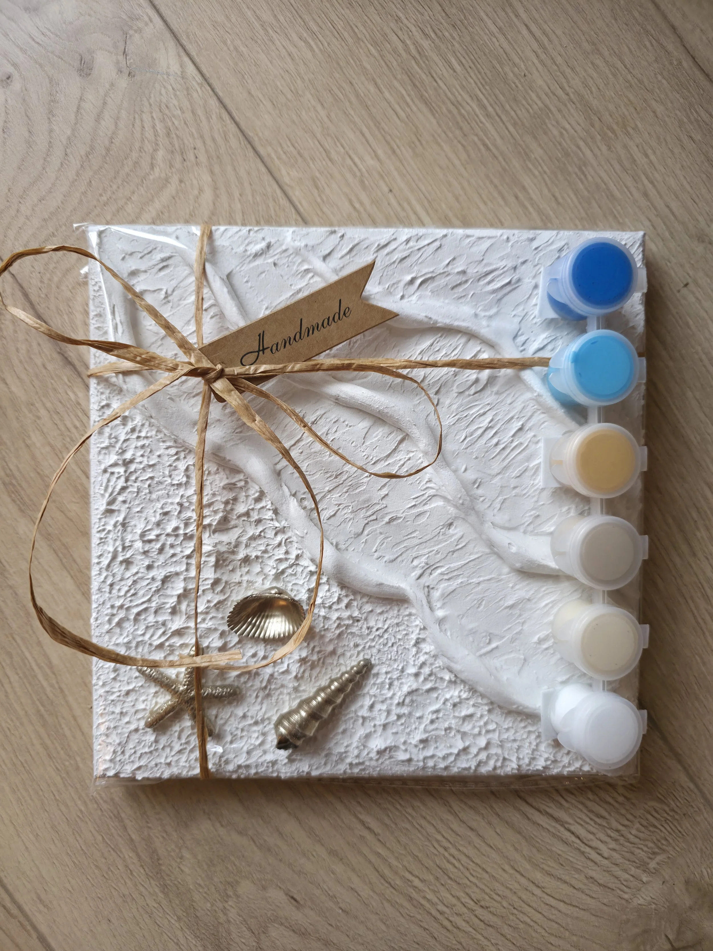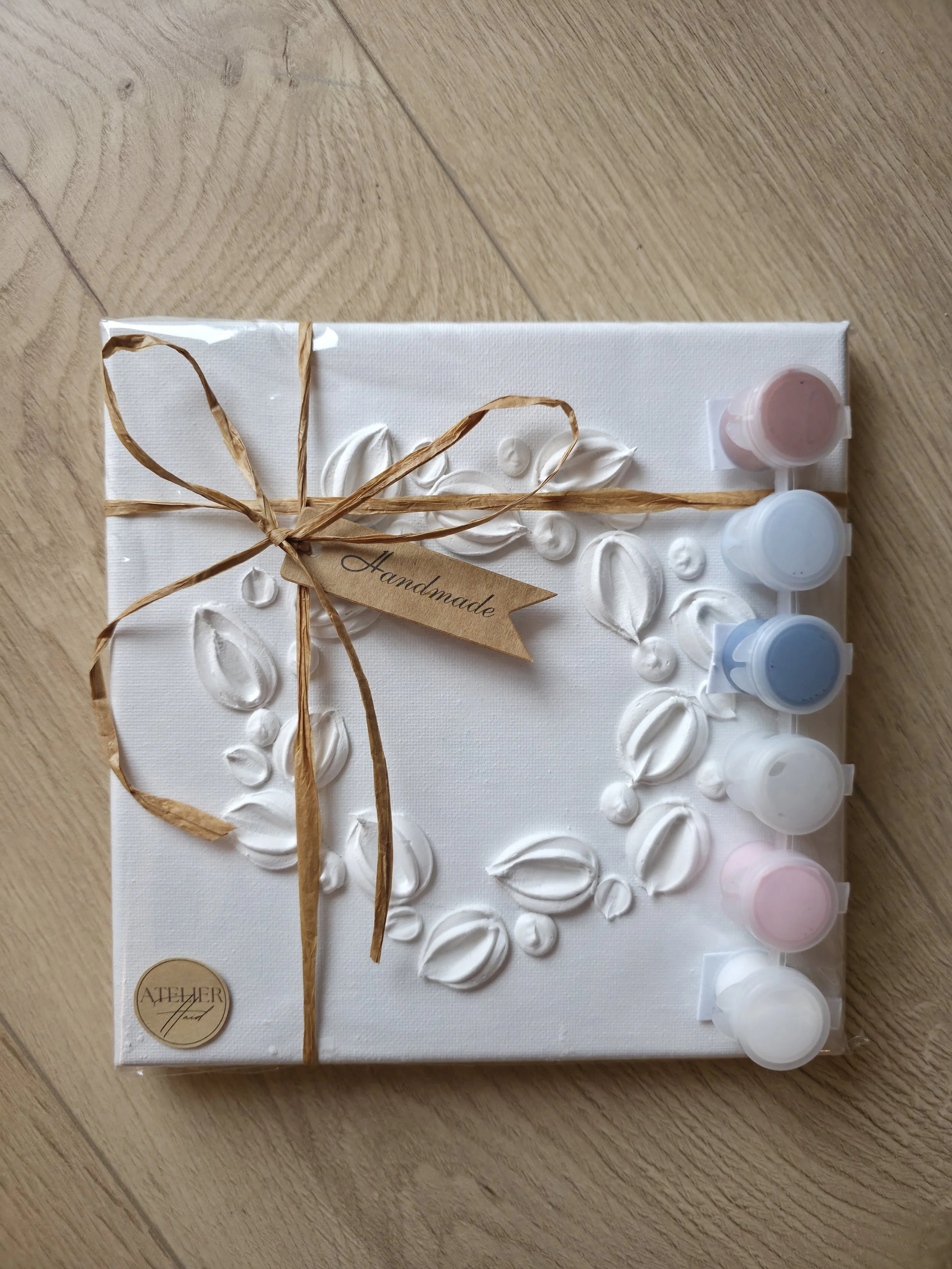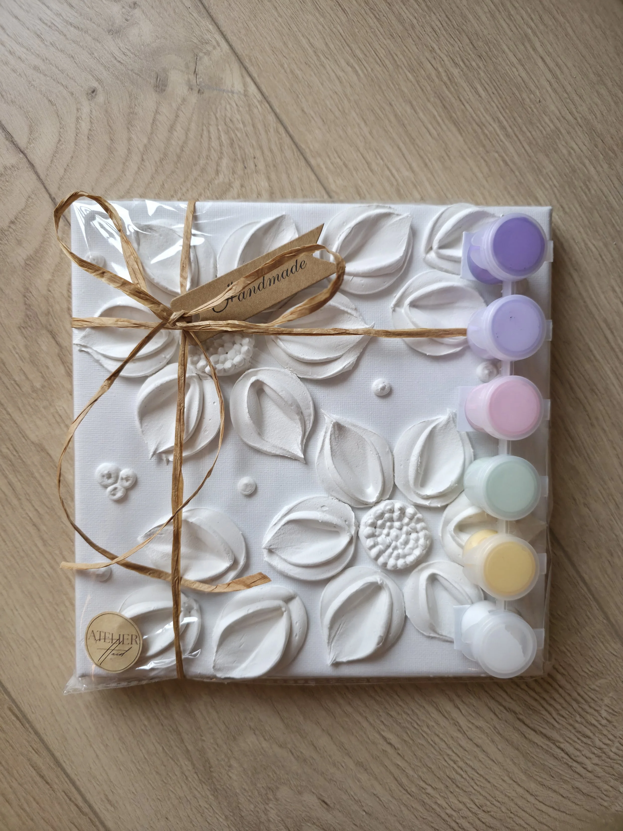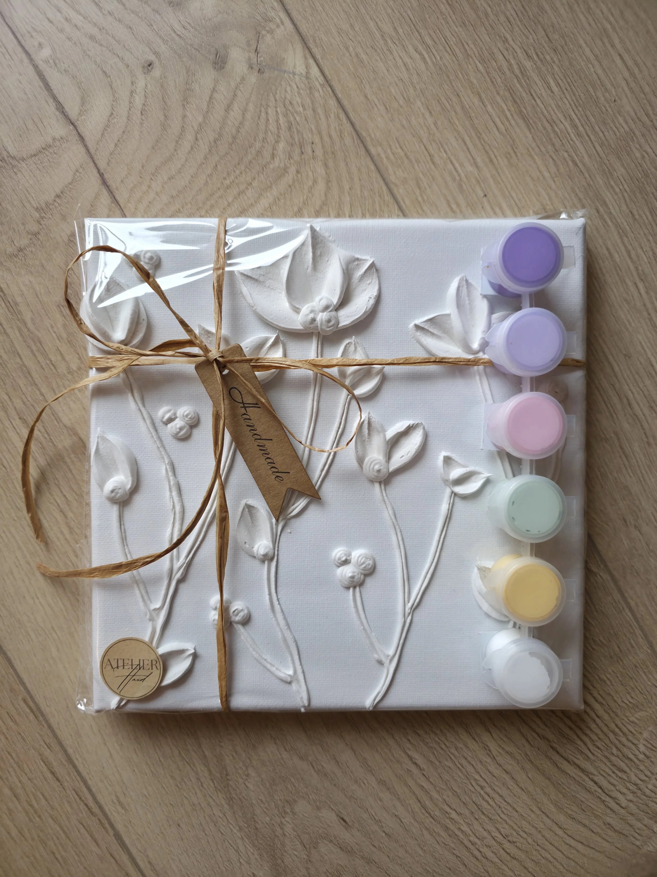 Jedes Set besteht aus einer 20×20 cm großen Leinwand mit einem von mir vorgefertigten Motiv aus Strukturpaste, 6 Acrylfarben und 2 Pinsel.